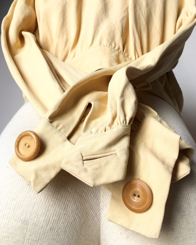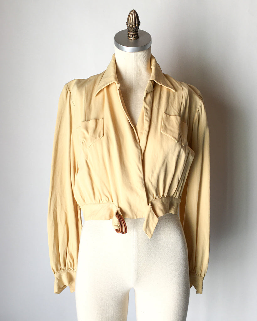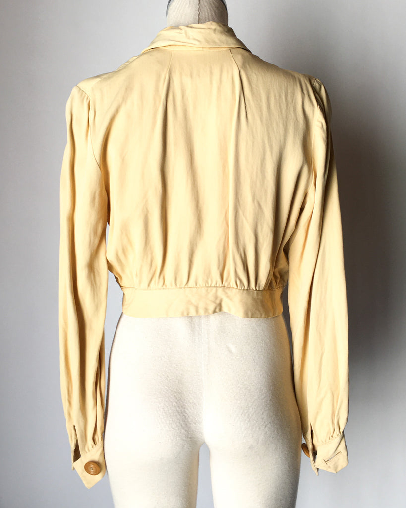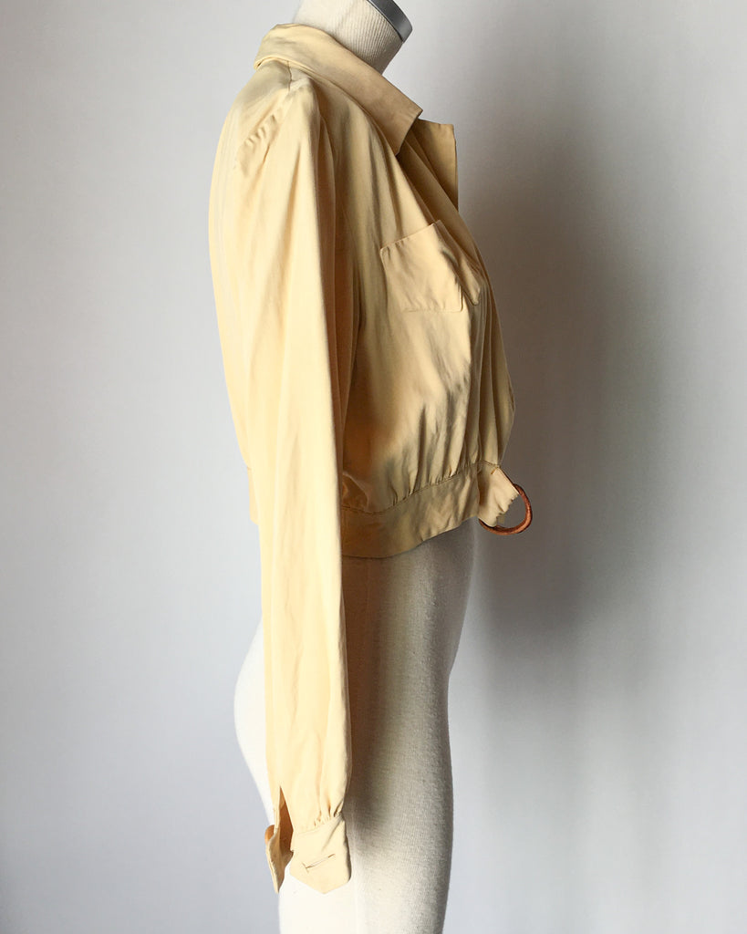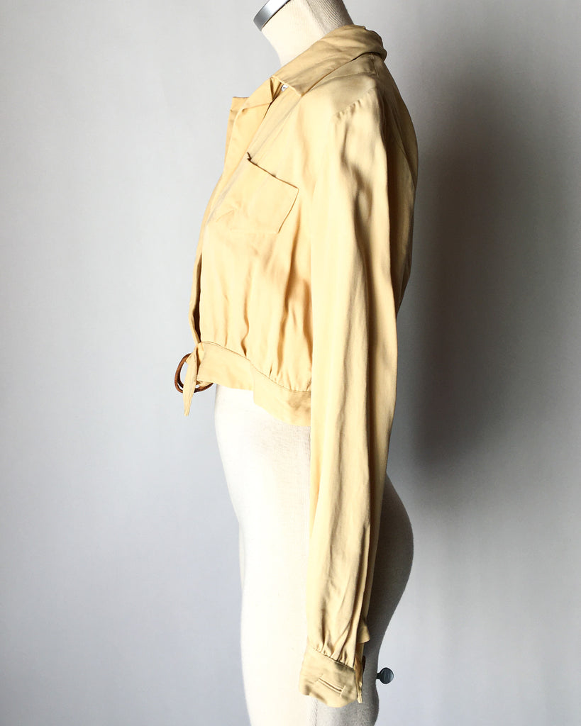 Soft fabric cropped jacket circa 1940’s. So much attention to detail and structure on these highly tailored 1940’s garments. Timeless wearability with high waisted pants and denim or even over a sweet feminine dress. Note the notched front pockets, belted waist with leather detailing, celluloid buttons at cuffs (showing their age as seen in photo). Distinct 1940’s collar & delicate pleating at cuffs give this a decidedly feminine vibe. The fabric appears to be a cotton, gabardine or rayon & cotton blend common to this era and has some nice weight to it that lends itself well to the jackets shape. Perfect light weight jacket for year-round styling.