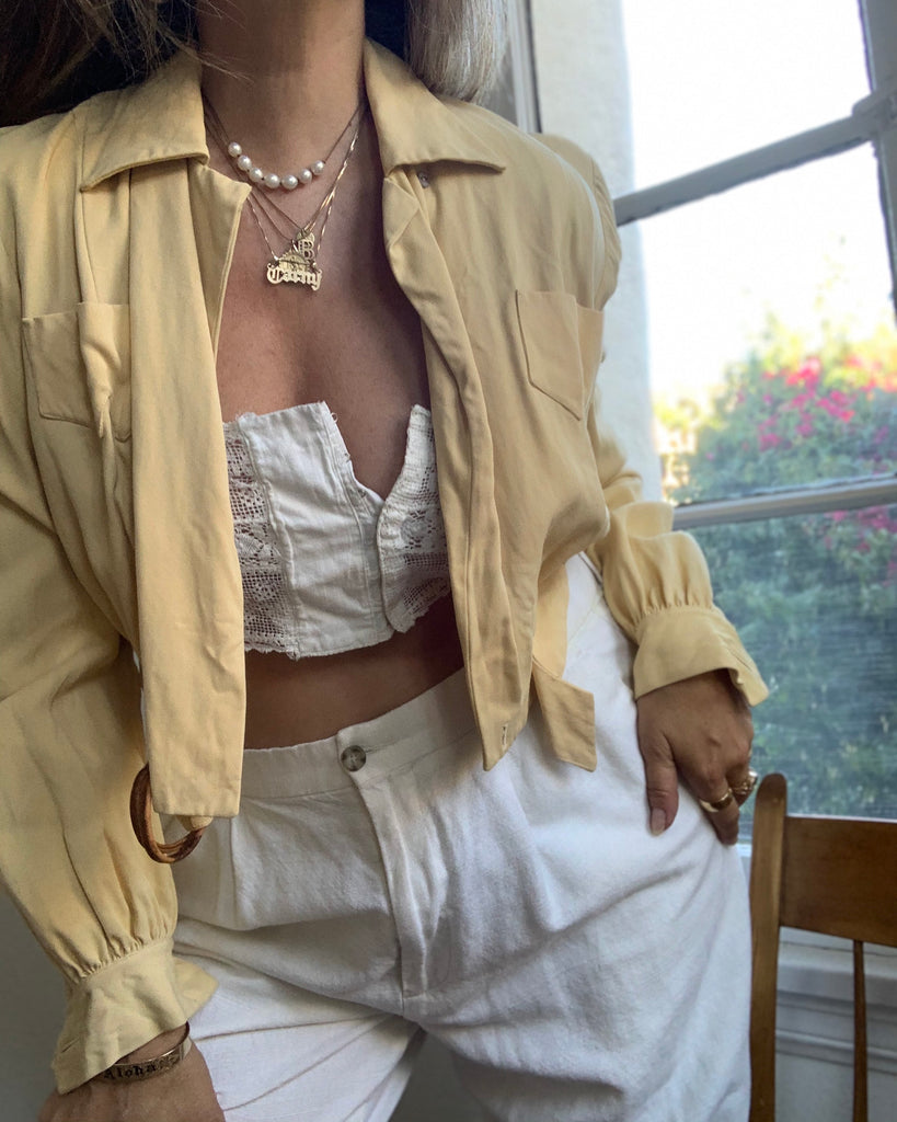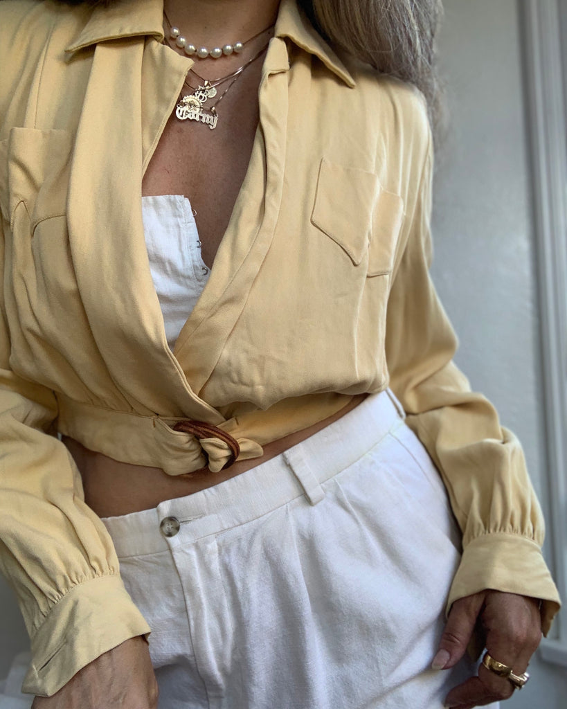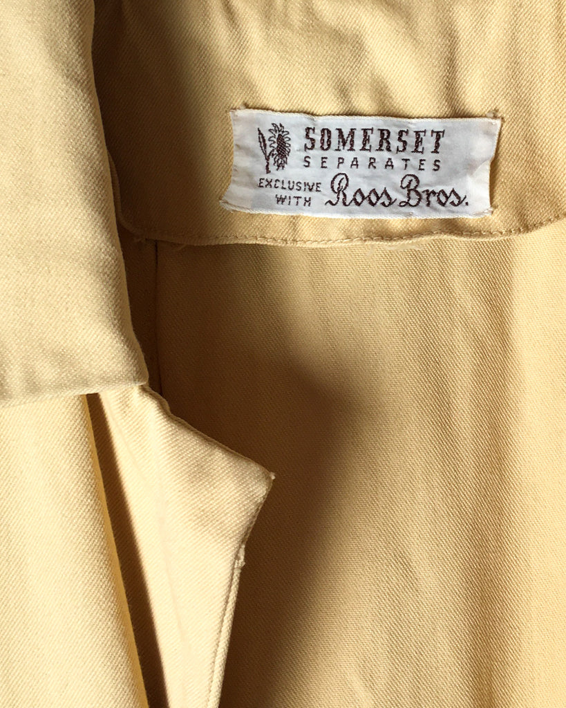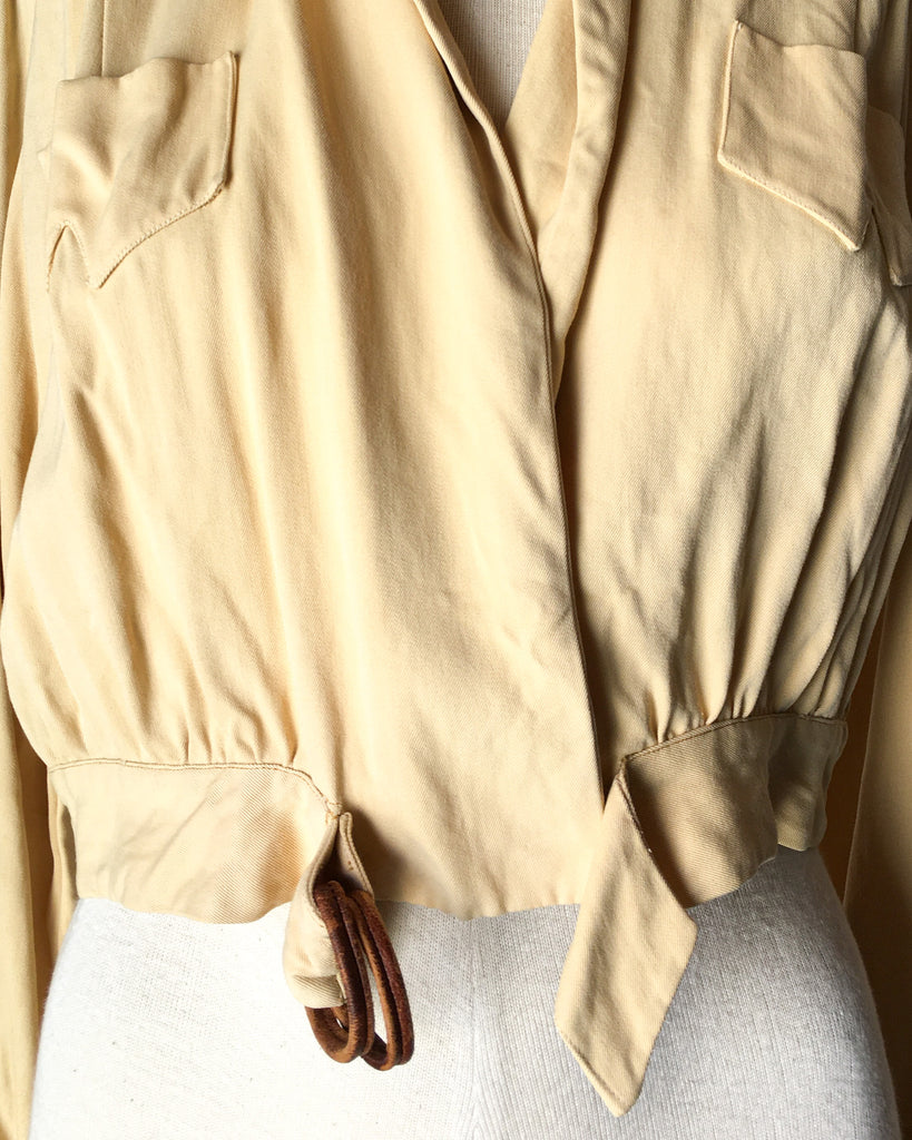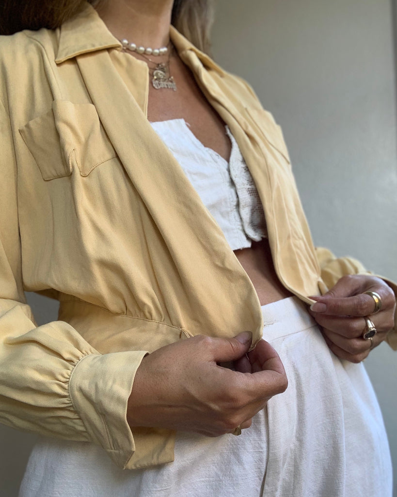 Soft fabric cropped jacket circa 1940’s. So much attention to detail and structure on these highly tailored 1940’s garments. Timeless wearability with high waisted pants and denim or even over a sweet feminine dress. Note the notched front pockets, belted waist with leather detailing, celluloid buttons at cuffs (showing their age as seen in photo). Distinct 1940’s collar & delicate pleating at cuffs give this a decidedly feminine vibe. The fabric appears to be a cotton, gabardine or rayon & cotton blend common to this era and has some nice weight to it that lends itself well to the jackets shape. Perfect light weight jacket for year-round styling.