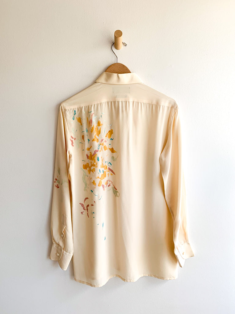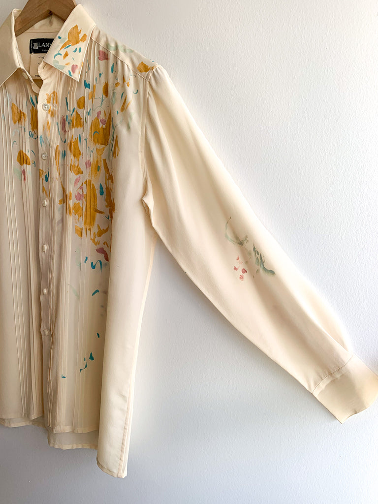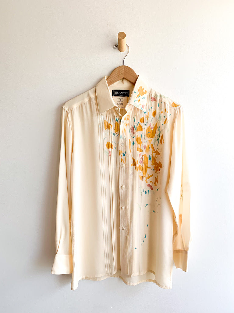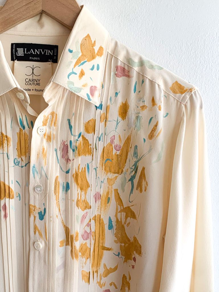 Silk Lanvin tuxedo shirt hand painted in Carny Studios. Bring a little abstract floral to your wardrobe.
