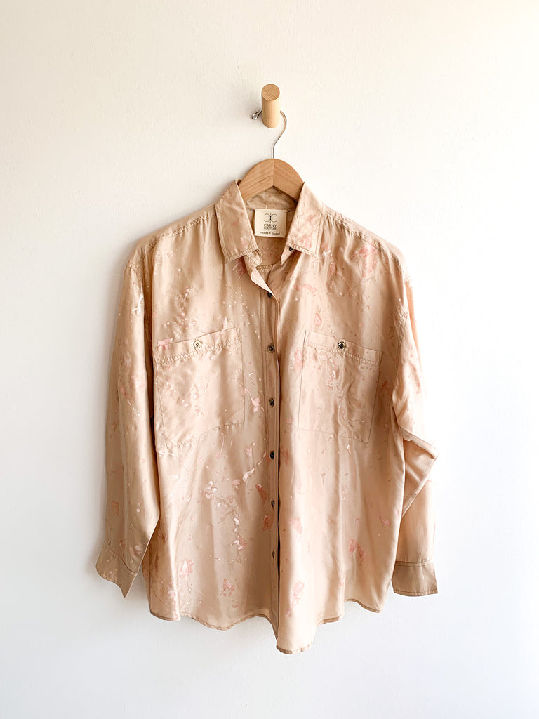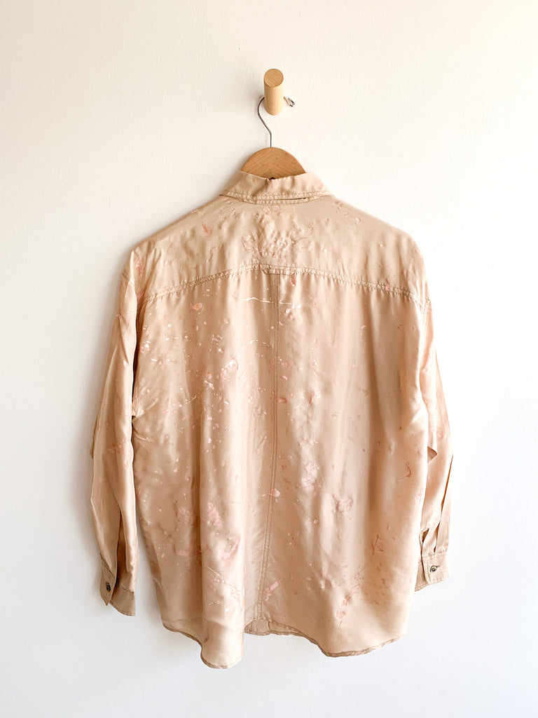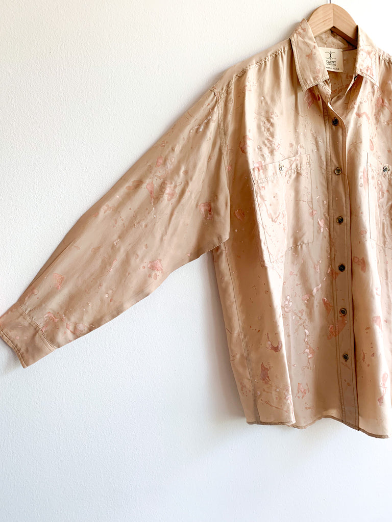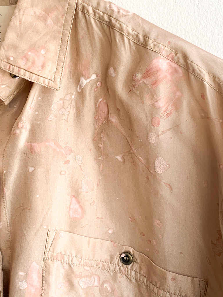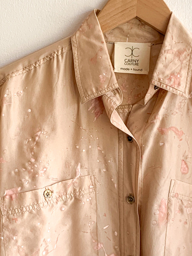 Wear this oversized splatter painted button front silk shirt with everything! Looks super good with white jeans. Strawberry on lightest tan silk gives a fresh approach to splatter painting. Hand painted Carny Studios original.
